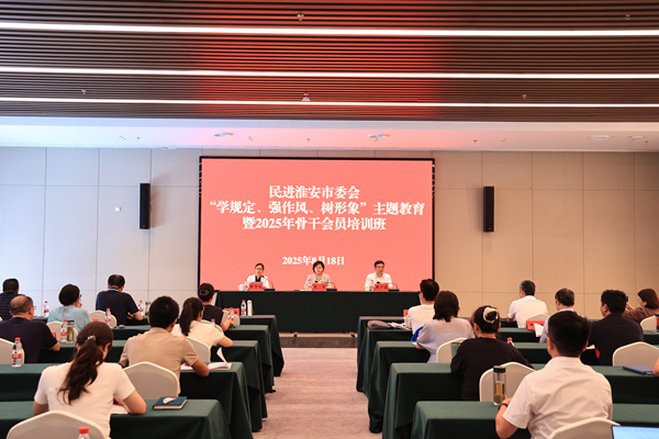 8月18日-19日,民進淮安市委會在恩來干部學院舉辦“學規定、強作風、樹形象”主題教育暨2025年骨干會員培訓班。市政協副主席、民進市委會主委李萍作動員講話,恩來干部學院常務副院長黃少基致辭,民進市委會專職副主委張智勤主持。民進市委會班子成員及部分委員、基層組織負責人、骨干會員、機關干部共50余人參加培訓。