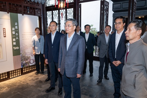 與會領導嘉賓參觀謝孝思誕辰120周年紀念展。主展廳用“黔山育才·江南結緣”“萬象更新·古城肇興”“遠見卓識·危難救急”“一核雙軸·古韻今風”4個篇章,詳細講述了謝孝思奔走呼號,修復園林和保護古城的事跡。兩側廂房設“藝術人生·筆墨寫意”“清正長留·風雨同舟”兩個篇章,展示了謝孝思為保護蘇劇、昆劇、彩繪、刺繡等蘇州文化元素所作的努力,以及他作為民進蘇州市地方組織主要創始人和核心領導者,為組織發展和“書畫擁軍”等特色工作開展作出的卓越貢獻。