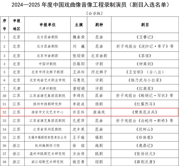 近日,文化和旅游部官網公布了2024—2025年度中國戲曲像音像工程錄制演員(劇目)入選名單,民進會員、淮安市文化藝術中心著名淮海戲表演藝術家、中國戲劇梅花獎獲得者、國家一級演員許亞玲憑借淮海戲《樊梨花點兵》成功入選。